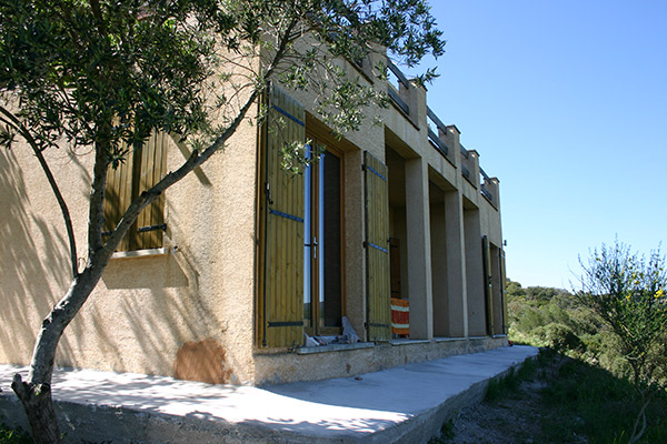 Das Haus befindet sich an einem Hang mit weiter Aussicht. Es hat
